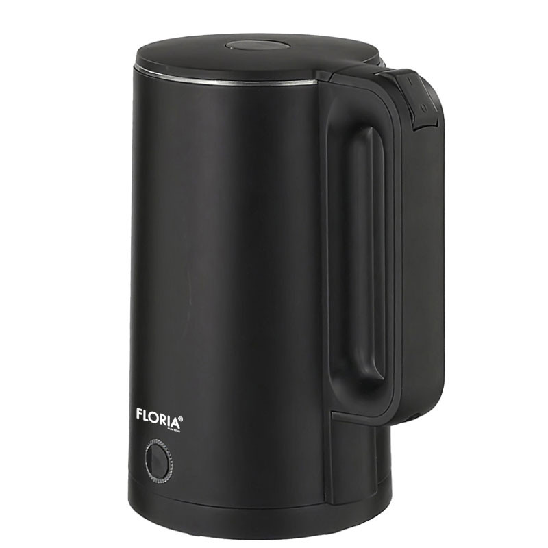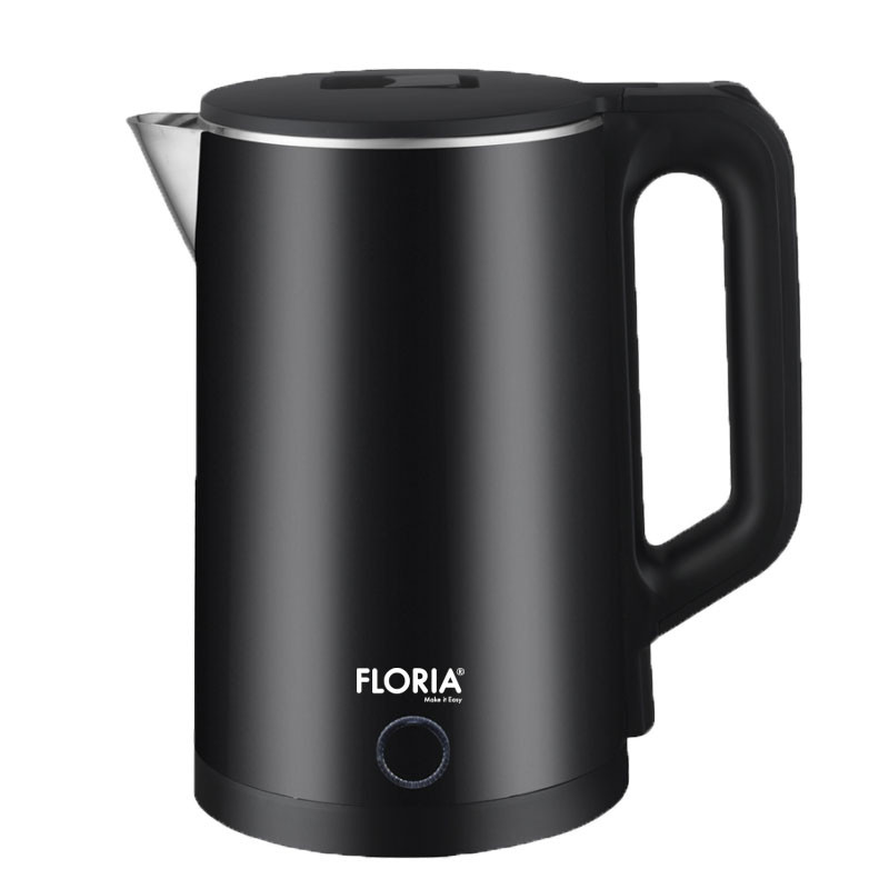 Bouilloire à Double Paroi FLORIA - Puissance: 1500 Watts - Capacité: 2 Litres - Base Pivotante 360° - Alimentation: 220-240V/50-60hz - Interrupteur marche/arrêt automatique/manuel - Boîtier à double paroi avec coque S/S - Couvercle verrouillable de sécurité - Élément chauffant dissimulé - Couleur: Noir - Garantie: 1an