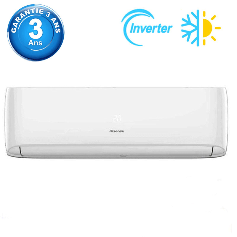 Climatiseur Hisense - Capacité : 12000 BTU - Mode : Chaud/ Froid - Classe énergétique : A++ - Type de gaz : R410A - Alimentation électrique : 220V-240V/50Hz - Filtre PP lavable - Affichage sur le panneau avant LED - Panneau amovible et lavable - Minuterie 24 heures - Minuterie MARCHE/ARRÊT - Mode silencieux - Tropicalisé - Fonction de détection intelligente - Dégivrage automatique - Couleur : Blanc - Garantie : 3 ans + 5 ans sur moteur