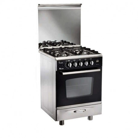 Cuisinière à gaz UNIONAIRE - Nombre de Foyers: 4 Foyers - Largeur: 60cm - Chaleur tournante - Tourne borche - Couvercle supérieur (LID): verre miroir - Capacité du four: 70 litres - Plaque supérieure: acier inoxydable - Grille en fonte - Thermostat - minuterie numérique avec horloge - Poêle au four - Pieds de nivellement - Dispositif de sécurité - Ventilateur de four - Auto-inflammation - Couleur: Inox - Garantie: 3 ans