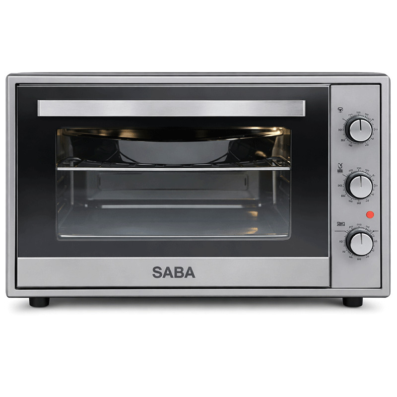 Four Electrique Saba 35500-L - Volume : 35Litres - Puissance : 2000W - Thermostat bimétallique - Plateau rond (428 mm) + plateau carré + grille - Poignée en aluminium - Double Vitre - Minuterie 90 min - Lampe de four - Panneau supérieur émaillé - Chaleur Tournante - Porte escamotable à 3 niveaux - Fonction Turbo - Couleur : Silver - Garantie : 1 an