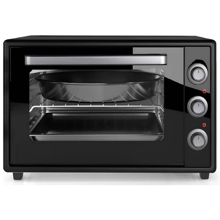 Four Électrique SABA - Volume: 60 Litres - Puissance: 2000 watts - Température Réglable - Minuterie: Mécanique jusqu'à 90min - Ventilateur turbo - Double verre - Élément chauffant en acier inoxydable - Cavité intérieure - Gauche/Droite/Inférieur/Supérieur- Panneau Émaillé - 1 plateau carré + 1 plateau rond + 1 grille - Couleur: Noir - Garantie: 1an