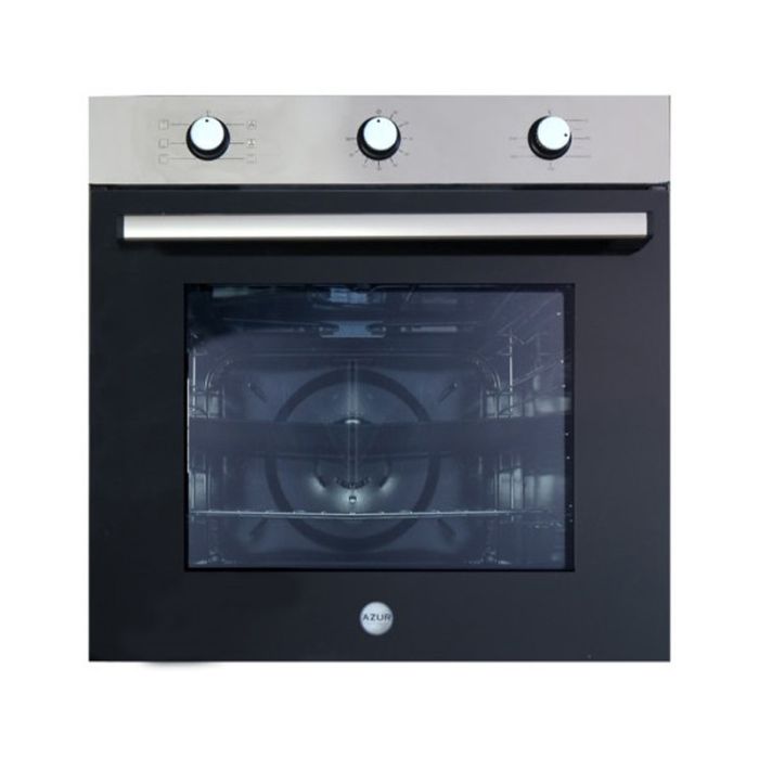 Four Encastrable AZUR Ventilé - Type de Gaz: Electrique - Volume: 76 Litres - Classe Énergétique: A - 7 Fonctions - Eléments chauffants haut et bas - Panneau INOX de 9 cm - Porte de four en verre amovible - Ventilateur turbo - Grille métallique revêtue de chrome Systéme - Lampe de four - Boutons Noirs avec dessus en Inox - poignée de couleur inox - 1x Plateau - 1x grille métalique de four - Couleur: Inox - Garantie: 2 ans