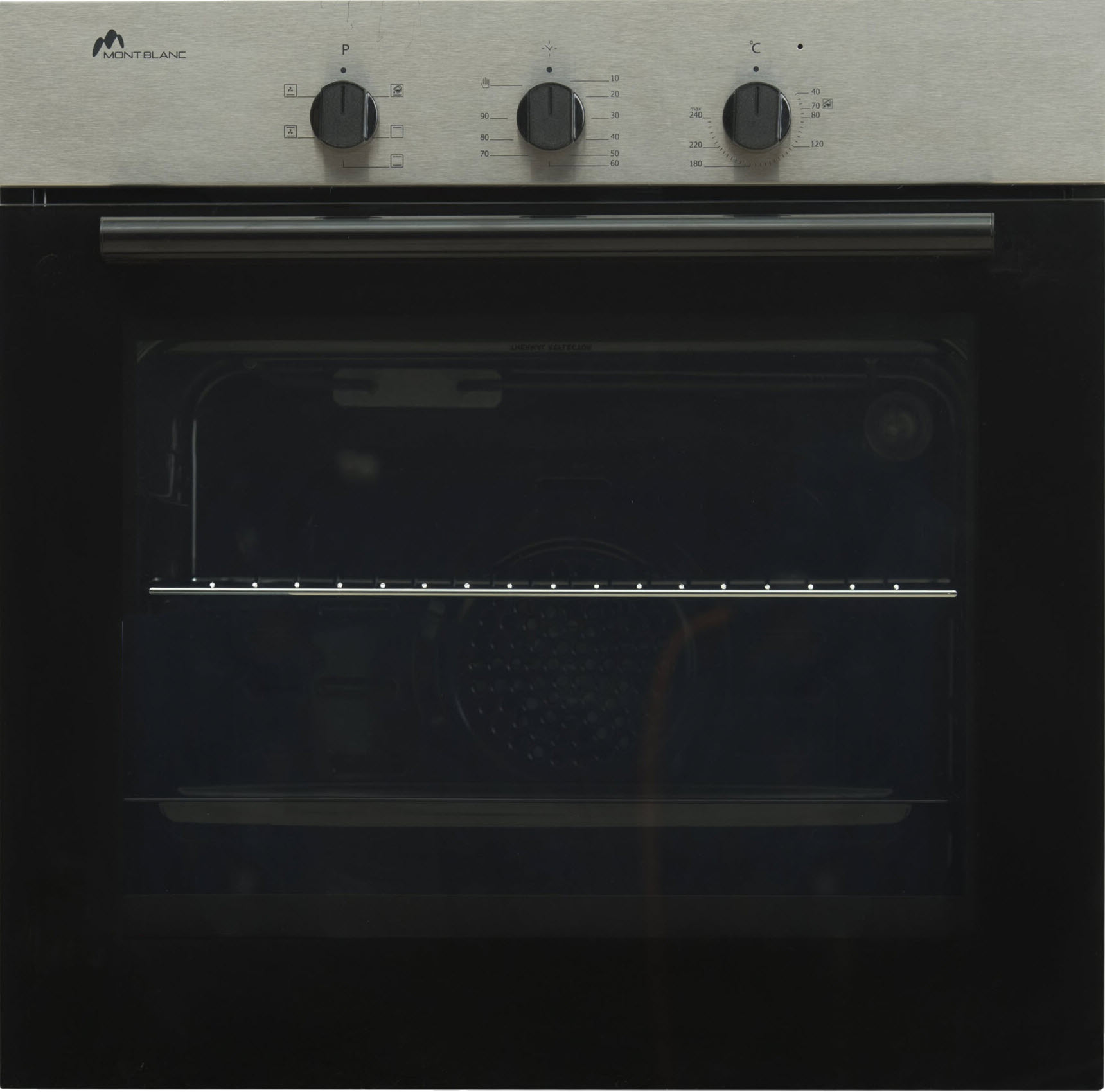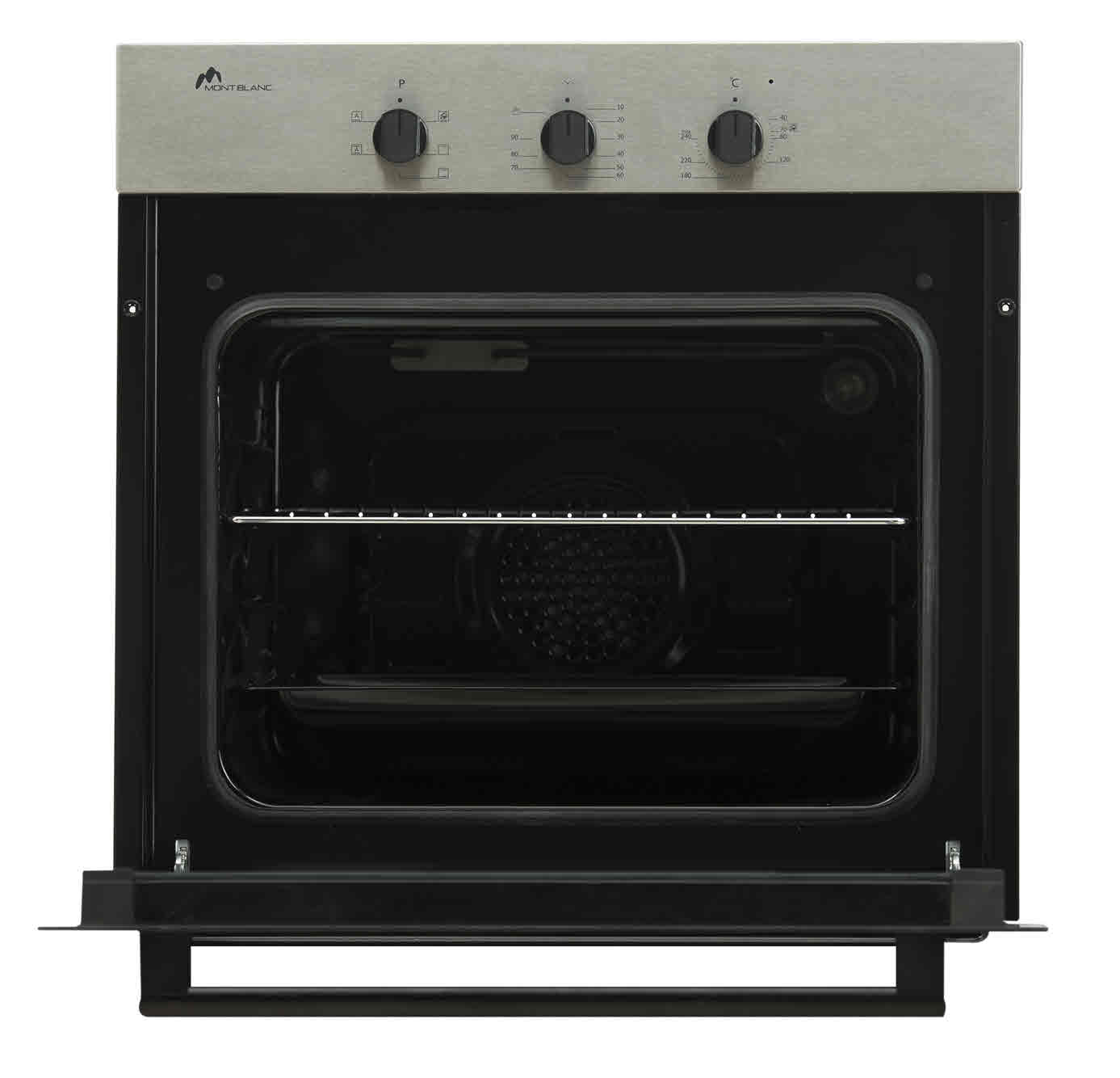 Four Encastrable Mont Blanc ECOX6F 60cm - Volume Brut: 56Litres - Puissance électrique totale: 2.23 Kw - Ventilateur: 22 W - lampe: 15 W - 6 fonctions - minuterie mécanique: 90 min - Porte de four amovible en verre -Plateau de cuisson - Grille de four - Poids: 30,5 kg - Couleur: Inox - Garantie 1 an
