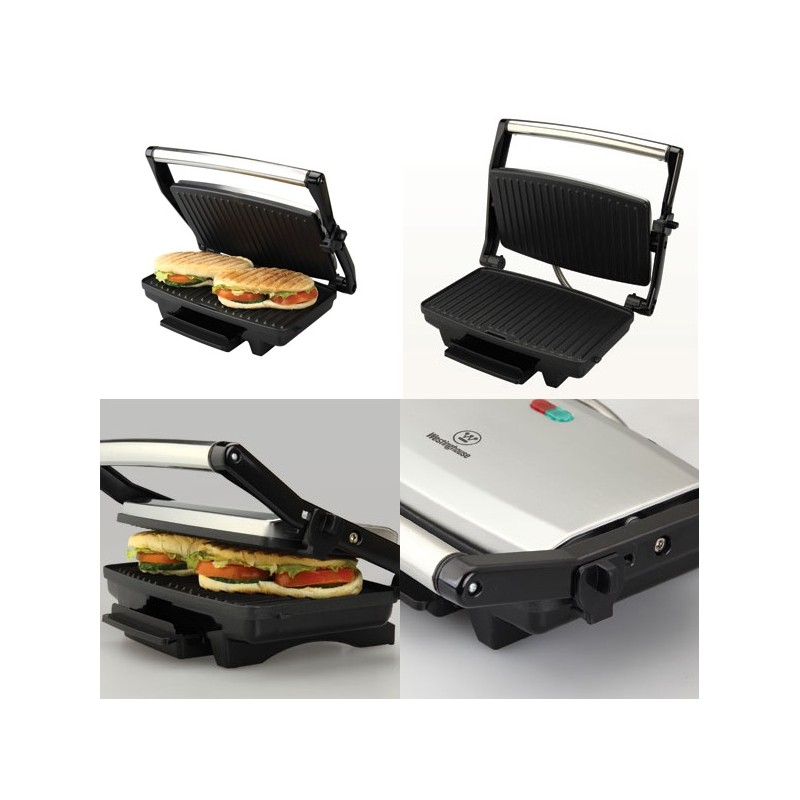 Grill Panini Westinghouse - Puissance: 1000 W - Gril à panini 2 tranches - Plaques à revêtement anti-adhésif pour un nettoyage facile - Couvercle en acier inoxydable brossé - Alimentation: 220 ~ 50Hz - Garantie 1 an