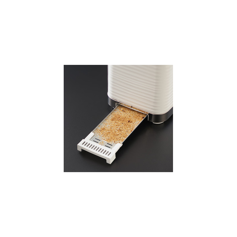 Design texturé haut de gamme en blanc brillant avec des touches d'acier - Technologie Lift’n Look, Vérifiez le brunissage à tout moment sans arrêter le cycle - Fentes extra larges pour tous types de pain - Niveau de brunissage ajustable - Fonction surélévation du pain - Réchauffe viennoiseries inclus - Tiroir ramasse-miettes amovible - Range cordon intégré - Pieds antidérapants - Puissance 1050 W - Couleur blanc - Garantie 1 an