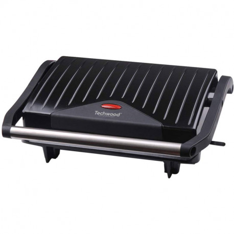 Grille Panini TECHWOOD - Puissance: 750 Watts - Contrôle automatique de la température - Système de verrouillage - Corps en bakélite - Poignée froide - Plaque grill antiadhésive - Témoin lumineux - Pieds anti dérapant - Dimensions: 30.7 x 10.9 x 24.9 cm - Poids: 1.3 kg - Couleur: Noir - Garantie: 1 an