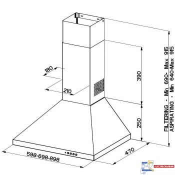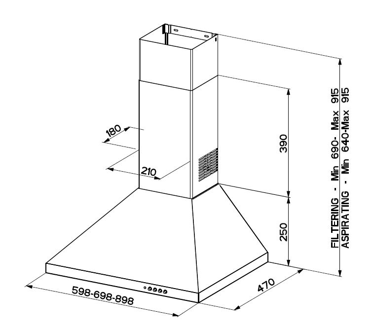 Mode de fonctionnement : Évacuation & recyclage - Débit d’évacuation maximum : 400 m3/h - Réglages de la vitesse : 3 présélections - Eclairage : Halogène - 56 Watt - Niveau sonore maximal : 68 dB - Filtres fournis : Charbon, filtre anti-graisse en aluminium (2 éléments).