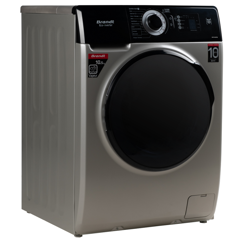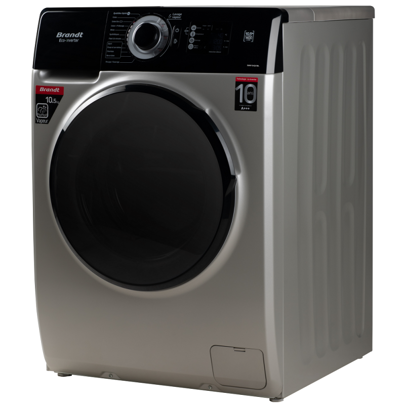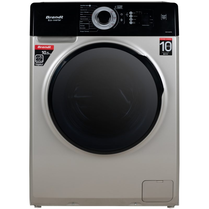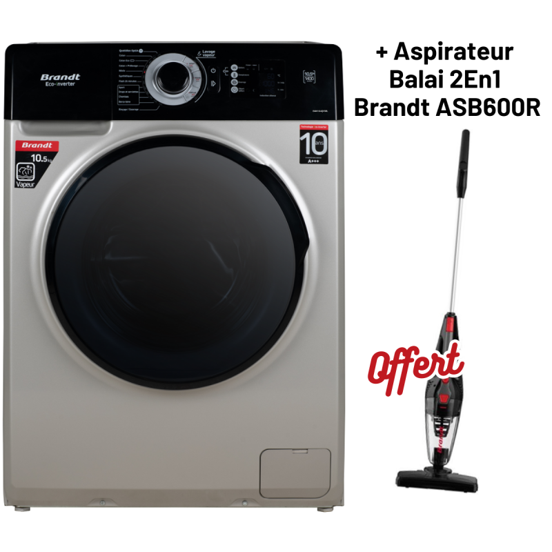 Machine à Laver Frontale Brandt - Moteur BLDC ( Eco-Inverter) - Avec vapeur - Capacité de lavage: 10.5 Kg – Vitesse d’essorage: 1400 tours/min – Classe énergétique A+++ – 12 Programmes - Avec afficheur LCD –Dimensions: 850x 600 x 650 mm - Couleur : Silver - Garantie 2 ans ( moteur inverter garantie 10 ans ) + Aspirateur Balai 2En1 Brandt ASB600R Offert
