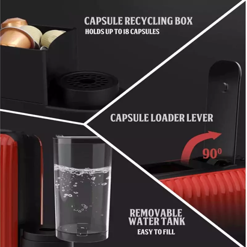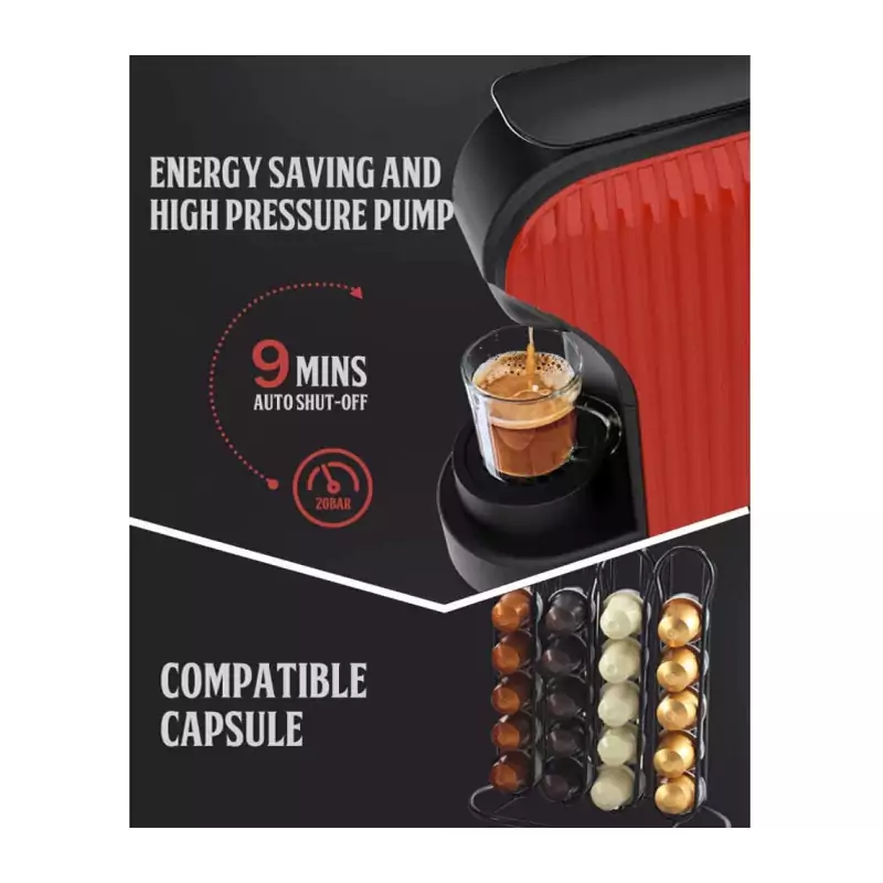 Cafetière Nespresso 1400W FLORENCE GS-316 – Tension : 220-240V – Fréquence : 50/60Hz – Puissance : 1400W – Pression : 19Bars – Réservoir : 800ml – 2 Niveaux de dosage : expresso court ou long – Pieds antidérapants – Hauteur adaptable a toutes tasses à café – Réservoir d’eau en plastique – Bac de récupération capsules : Jusqu’à 15pièces – Dimension : 30*23*12cm – Couleur : Rouge – Garantie : 1An