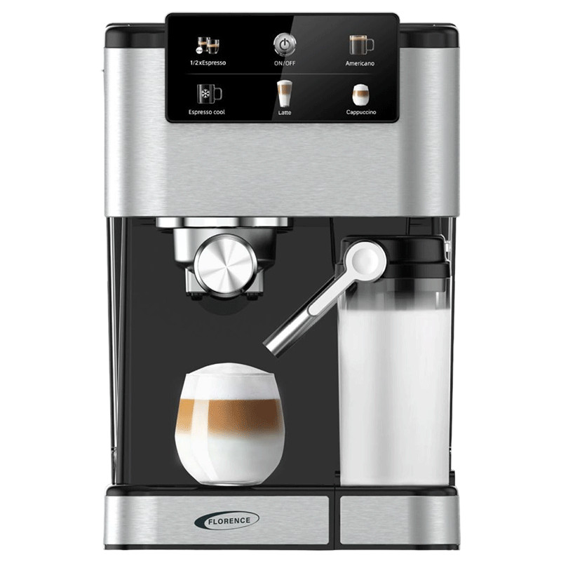 Machine à Café 5EN1 Expresso FLORENCE - Capacité: 1.5 Litres - Pression: 20 bars - Puissance: 1350 Watts - Avec afficheur - Contrôle tactile - Réservoir d'eau amovible - Capacité du réservoir d'eau: 500ml - Mousseur à lait intégré - Matière: Acier inoxydable - Avec une porte filtre à capsules Nespresso - Bac d'égouttage amovible pour un nettoyage - Tête panatela réglable pour mousseux - Design compact et élégant - Facilité d'entretien - Couleur: Chrome - Garantie: 1 an