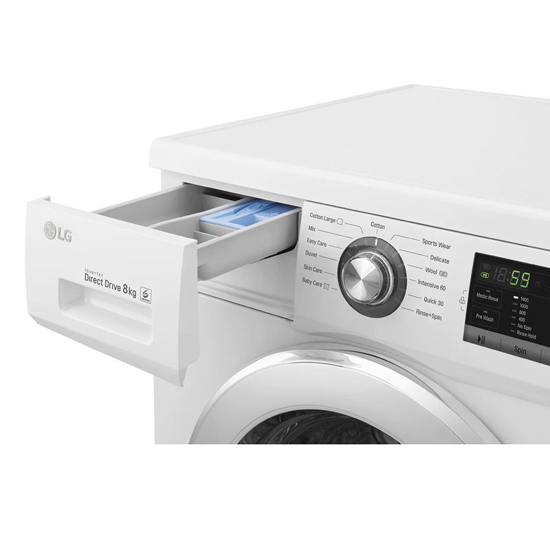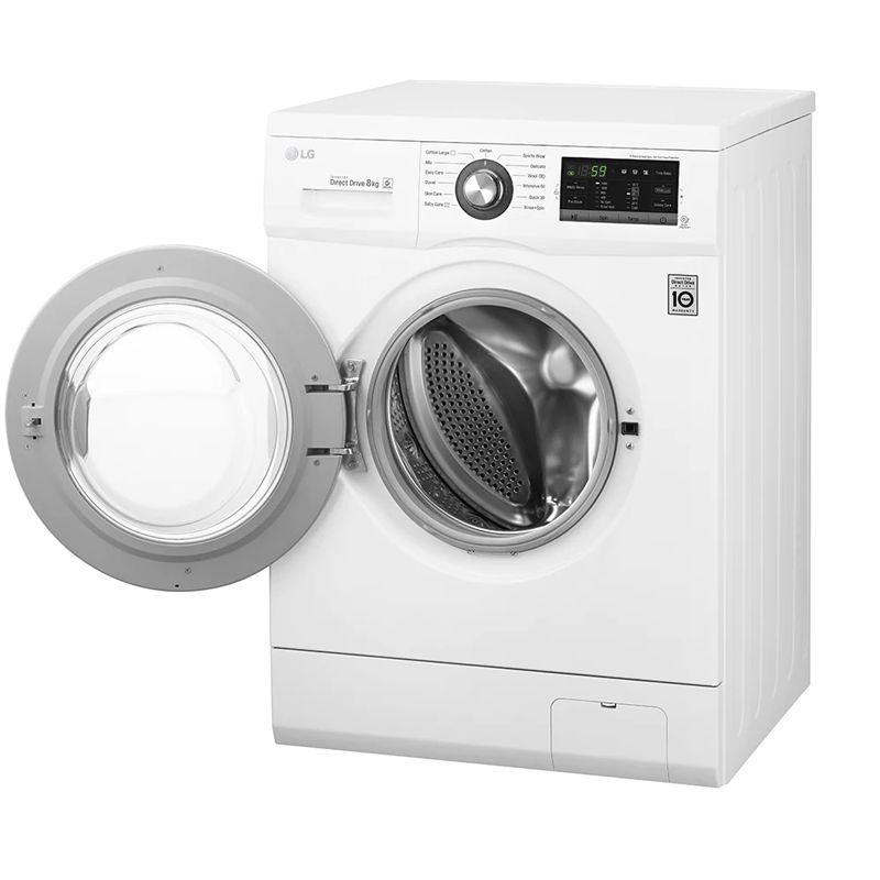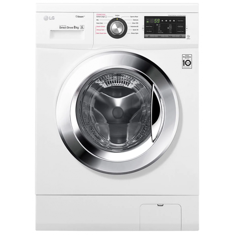 Lave linge Frontale LG - Capacité de lavage: 8 Kg - Nombre de Programmes: 13 - Vitesse d’essorage: 1400 tours/min - Classe énergétique: A+++ - 6 Motion - Inverter Direct Drive™ - Smart Diagnosis - Afficheur LED - Indication de démarrage/pause - Indicateur de verrouillage de porte - Dimensions: 600 x 550 x 850 mm - Poids: 59 kg - Couleur: Blanc - Garantie: 3 ans - Garantie 10ans sur Moteur