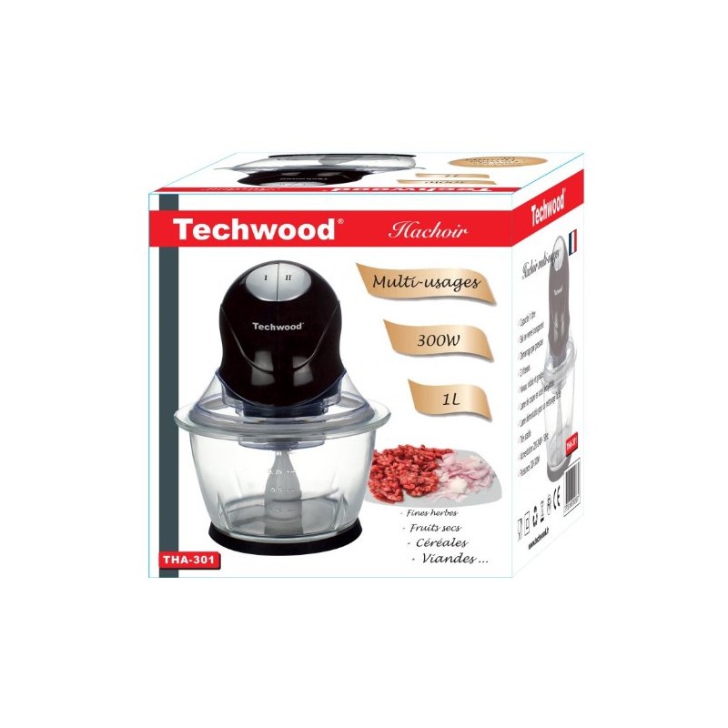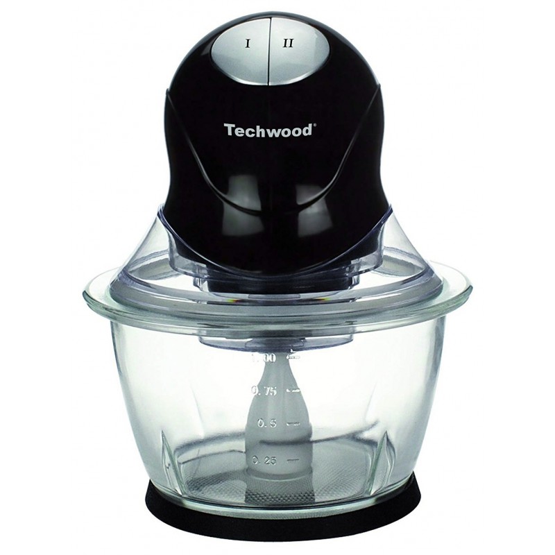 Mini Hachoir TECHWOOD - Puissance: 300 W - Capacité du bol: 1 Litre - Réglages de la vitesse: 2 - Récipient transparent en verre - Démarrage par pression - Hachoir amovible - Lame en acier inoxydable - Fonctionne par impulsion - Démontable pour un Nettoyage facile - Idéal pour: Viande, Fromage, Noix, Persil - Alimentation: 230V ~ 50Hz - Couleur: Noir