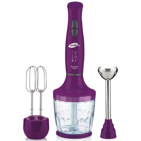Mixeur 2en1 GOLDMASTER - Puissance: 1000 Watts - Capacité du Bol: 0.8 Litre - Boutons de réglage de la vitesse du processus normal et turbo - Arbre du mélangeur en acier inoxydable - Appareil de mélangeur en acier inoxydable - Utilisation ergonomique Tampon antidérapant - Couleur: Violet - Garantie: 1 an