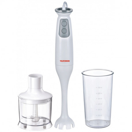 Mixeur Plongeant 3en1 TELEFUNKEN - Puissance: 400 Watts - Capacité Bol: 700 ml - Nombre de vitesses: 2 Vitesses - Hachoir avec Lame inoxydable - Nterrupteur marche / arrêt - Poignée ergonomique - Pied de mixeur à main en plastique - Couleur: Blanc - Garantie: 1 an