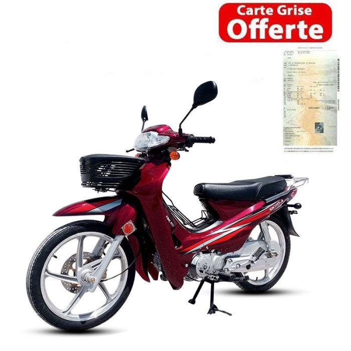 Moto SENKE SK 110 - Cylindrée: 107 cm³ - Moteur: 4 temps - Refroidissement: A air - Vitesses: 4 - Type transmission: chaine - Type de frein: AV Disque / AR tambour - Freinage: AV à la main / AR par pied - Systéme démarrage: électrique / a pidale - Pneu: Avant/Arrière: 2.50-17 / 2.75-17 - Poids: 90kg - Couleur: Rouge - Garantie: 2000 kmCarte Grise Offerte