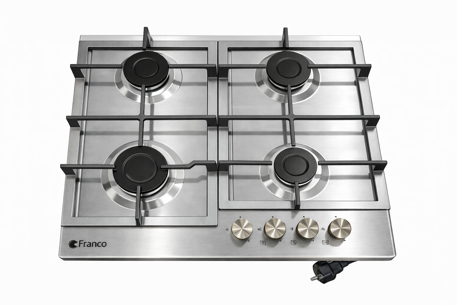 Plaque de cuisson FRANCO 343IF - 4 feux à gaz: Brûleur rapide - Commandes par boutons latérales - Allumage automatique une main - Plaque encastrable de 60 Cm - Avec support en fente - Couleur : Inox - Garantie 1 an