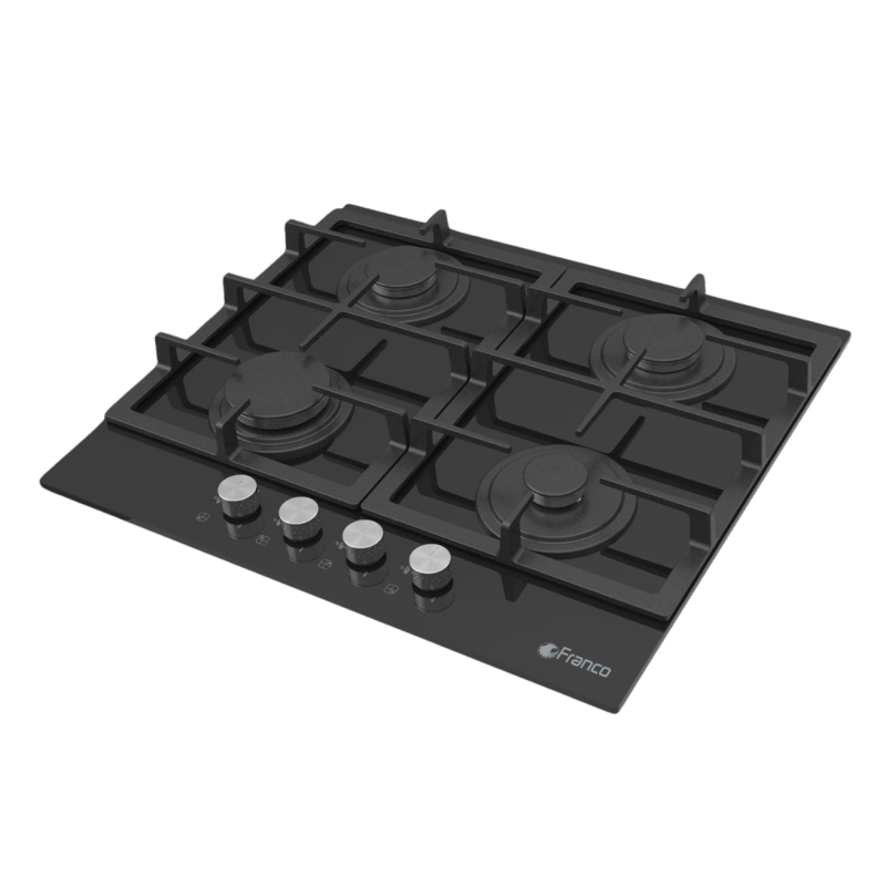 Plaque de cuisson FRANCO 444BF - 4 feux à gaz: Brûleur rapide - Commandes par boutons latérales - Allumage automatique une main - Plaque encastrable de 60 Cm - Avec support en fente - Couleur Noir - Garantie 1 an