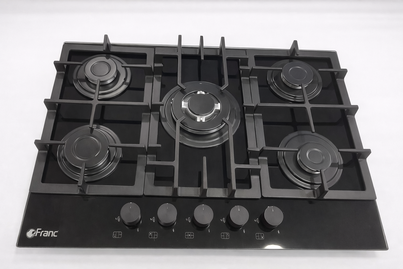 Plaque Encastrable FRANCO - Largeur : 70cm - Nombre de Bruleurs : 5 bruleurs à Gaz (Auxiliaire : 1x 1000W + Semi rapide : 2x 3500W (1750W + 1750W) + Rapide : 1x 2500W + Brûleur de travail : 1x 3300W) - Type de Gaz : Gaz Naturel - Commande Latérales - Grilles En Fonte - Allumage Automatique - Couleur : Noir- Garantie 2 ans