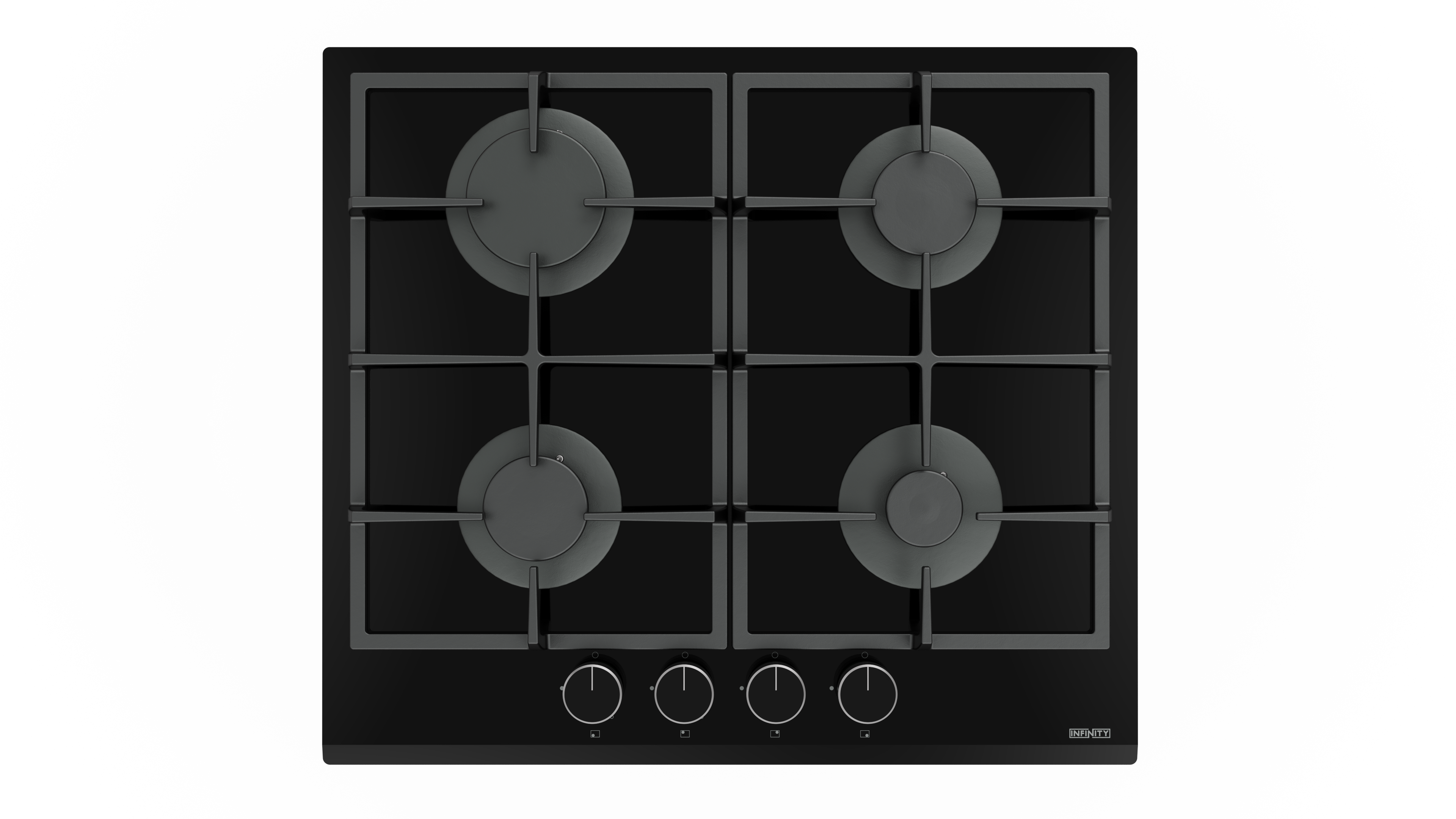 plaque de cuisson 60 CM • Verre trempé noir 8 mm • 4 Brûleurs à gaz Sabaf • Grilles en fonte • Allumage Automatique • Sécurité par thermocouple • Encastrement (cm): 56*49 - Garantie : 2 ans