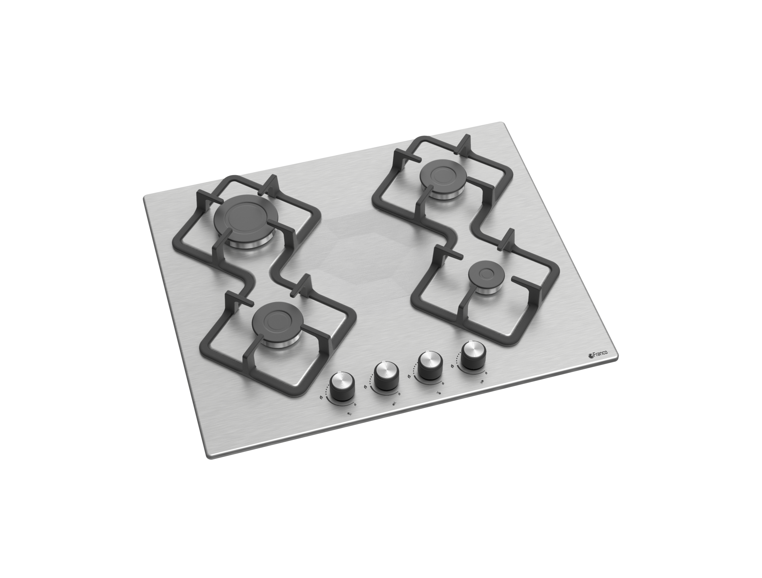 Plaque de cuisson 60 cm - 4 feux à gaz: Brûleur rapide / 2x Brûleurs semi-rapides / Petit brûleur - Commandes latérales - Allumage automatique une main - Dimensions: 52 x 59 cm - Couleur Inox - Garantie 1 an
