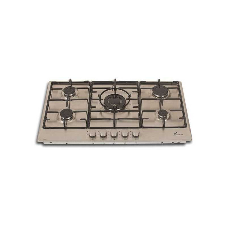 Plaque de cuisson MontBlanc PXS90/5 - 5 Feux - Allumage électrique - Type du gaz LPG G30 cm - Grande cheminée: 3.6kw - Brûleur moyen: 1.78kw - Petit Brûleur: 0.88 kw - Puissance totale du Gaz: 11.04 kw - Dimensions: 90 cm - Couleur: Inox - Garantie 1 an