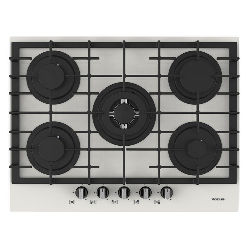 Plaque de Cuisson Focus Vitro- Largeur: 70 cm- Nombre de foyers: 5 Brûleurs à gaz, l’un Triple Couronnes- Flamme stabilisée- Grilles et chapeaux de brûleurs en fonte- Allumage: automatique- Commandes: frontales- Couleur: Blanc- Garantie: 2 ans