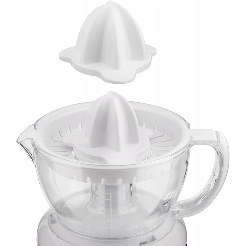 Presse Agrumes Électrique Ufesa EX4934 - Capacité 0.7L - Puissance 40 W - Couleur Blanc et Rouge - pour Citrons et Oranges - Matériau Plastique - Poids 1.5 Kg - Voltage 230 V - 2 cônes de différentes tailles pour petits et grands fruits - Pelles pour pousser la pulpe - Entièrement démontable pour un nettoyage pratique - Passe au lave-vaisselle (sauf base) - Dimensions du produit 16 x 16 x 20 cm - Diamètre 0.16 Mètres - Garantie 1 an