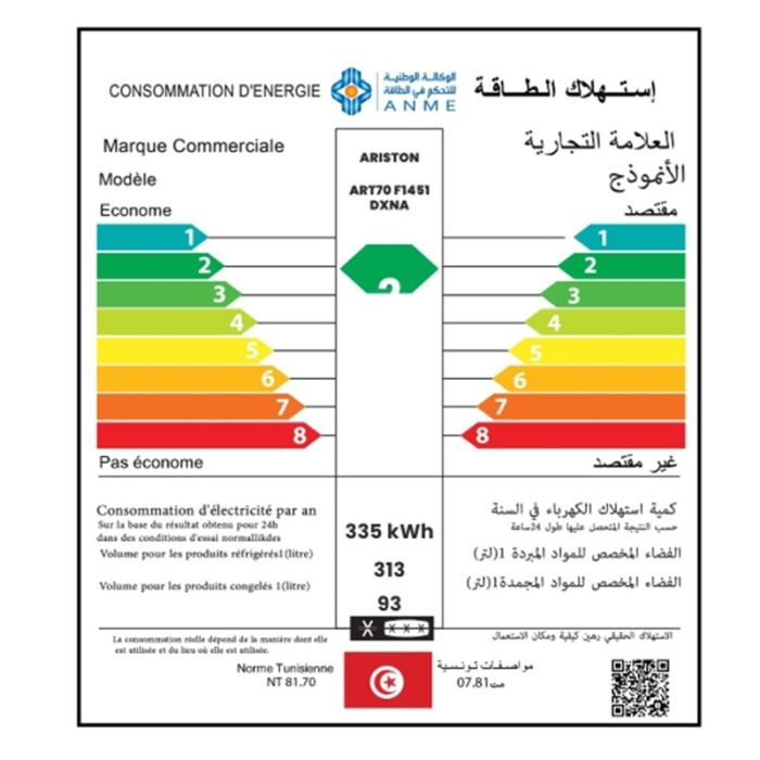 Réfrigérateur ARISTON - 2 Portes - Système de Refroidissement: NoFrost - Volume brut: 455 Litres - Volume net: 406 Litres - Volume Net du Réfrigérateur: 313 Litres - Volume Net du Congélateur: 93 Litres - Capacité de congélation: 6 kg/24h - Classe énergétique: A++ - Consommation d'énergie: 335 kWh/an - Éclairage LED - Compresseur Inverter - R600a - Niveau sonore: 39 dBA - 4 étagères (3 étagères réglables pleine profondeur) - 1x Bac à Légume - 4x Balconnets - Bacs à glaçons - Dimensions: H x L x P: 185 x 70 x 70 cm - Couleur: Inox - Garantie: 3 ans