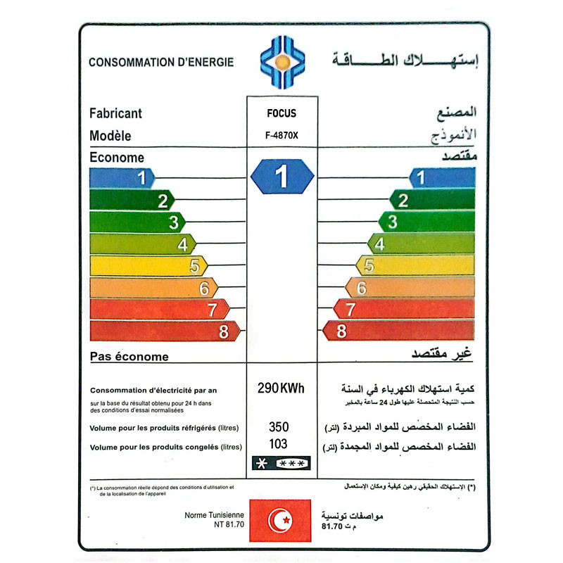 Système de Dégivrage : No Frost (Froid Ventilé) - Classe énergétique : 1 - Volume Net Totale : 453 Litres (Réfrigérateur : 350 Litres , Congélateur : 103 Litres) - Consommation d'énergie annuelle : 290 KWh - INVERTER : Non - Eclairage LED - Nombre d'étoiles congélateur : ★★★★ - Niveau Sonore : 44 dB - Clayettes en verre - Fonction alarme porte ouverte - Sécurité Enfants - Eclairage LED - Dimensions (LxHXP) : 700 x 1860 x 712 mm - Type de Gaz : R600a - Couleur : inox - Garantie 2 ans