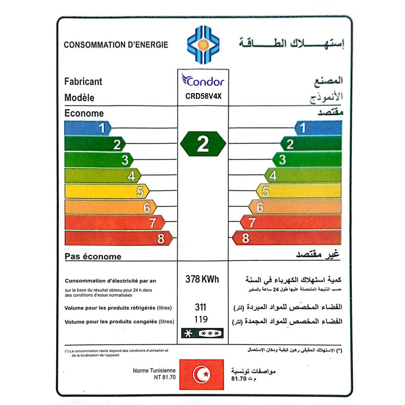 Système de Dégivrage : De Frost - Classe énergétique : 2 - Volume Net Totale : 430 Litres (Réfrigérateur : 311 Litres , Congélateur : 119 Litres) - Consommation d'énergie annuelle : 378 KWh - INVERTER : Non - Eclairage LED - Nombre d'étoiles congélateur : ★★★★ - Bac à légumes Compact - Niveau Sonore : 43dB - Dimensions (LxHXP) : 700 x 1723 x 691 mm - Type de Gaz : R600a - Couleur : inox - Garantie 2 ans
