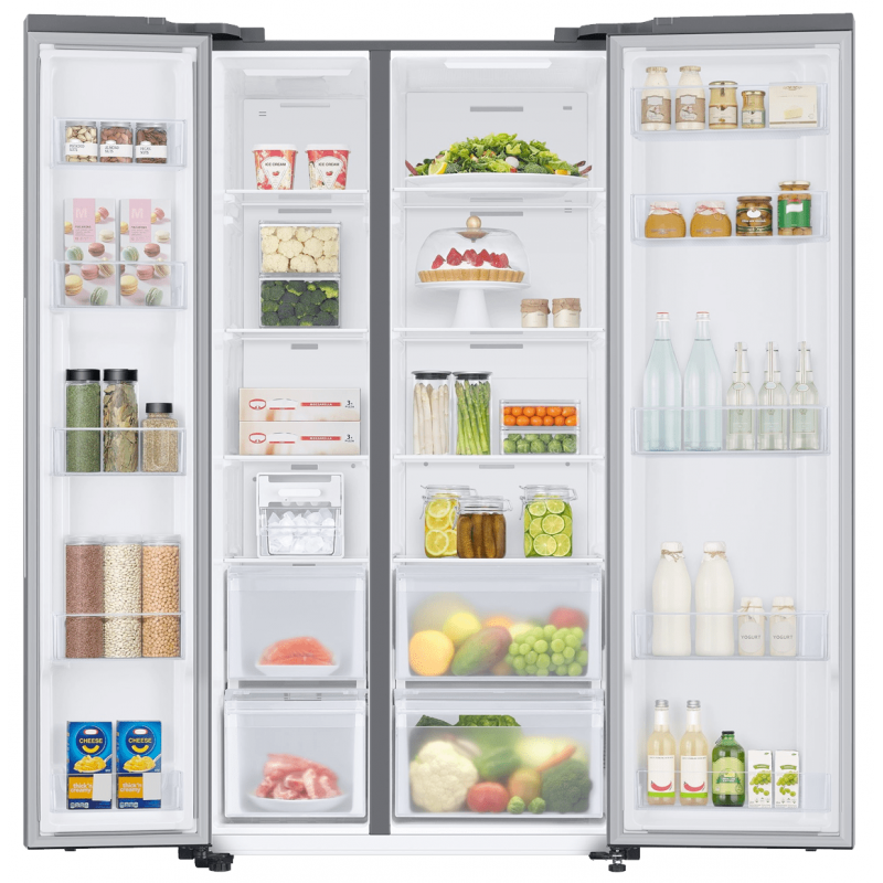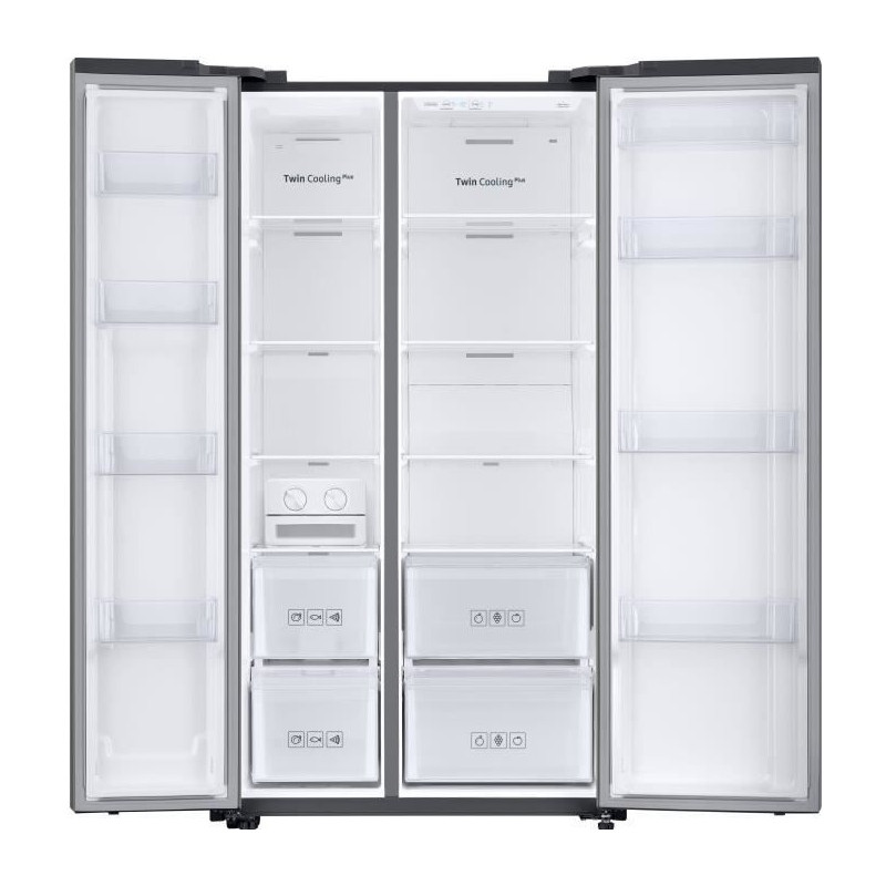 Réfrigérateur SAMSUNG Side By Side 2 Portes - Système de refroidissement: NoFrost - Volume Brut: 652 Litres - Capacité réfrigérateur: 409 Litres - Capacité congélateur: 243 Litres - Classe Energétique: A+++ - Réfrigérant: R600a - Niveau Sonore: 36 dBA - Consommation énergétique par an: 389 kWh/an - Type de refroidissement: Technologie Twin Cooling - Compresseur: Digital Inverter - Froid ventilé - Multi-Flow - Fonction réfrigération rapide - Eclairage intérieur LED - Alarme sonore porte ouverte - Dimensions: 912 x 1780 x 716 mm - Poids: 112 kg - Garantie: 3 ans (10 ans sur moteur)