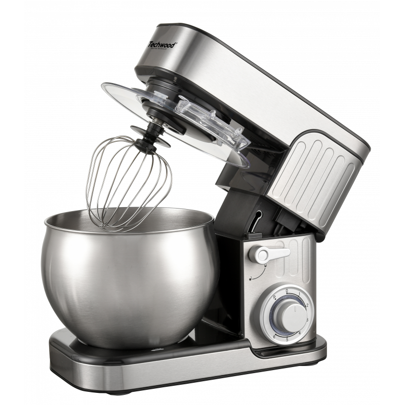 Robot Pétrin TECHWOOD - Puissance: 1300 Watts - Capacité du Bol: 6 Litres - Nombre de Vitesses: 6 Vitesses de rotation + impulsions - Mouvement planétaire pour un mélange parfait - Inclinaison du bras avec bouton de verrouillage pour un accès facile - Alimentation: 220-240V~ 50Hz - Accessoires inclus: Crochet pétrisseur, Fouet, Batteur plat, Couvercle Anti Eclaboussures, Spatule - Couleur: Inox - Garantie: 1 an