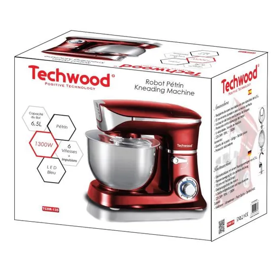 Robot pâtissier pétrin Techwood TCDR-135 - Robot pétrin grenat bol inox - Puissance électrique : 1300 Watt - Capacité : 6.5L - Vitesses : 6 Fonction pétrin, batteur et fouet - Mouvement planétaire - Protection contre les surcharges du moteur - Bras inclinable avec bouton de verrouillage - Interrupteur de sécurité - Pieds antidérapants - Inclus Couvercle transparent avec ouverture 1300W - Couleur : Rouge - Garantie : 1 an