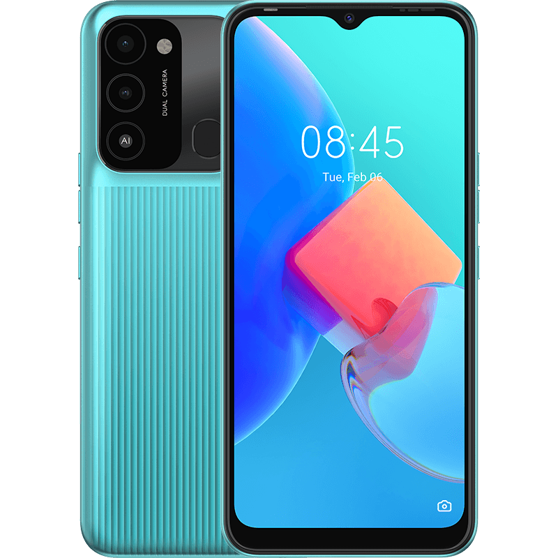 Double Sim - Ecran 6.52" HD+ - Résolution 720 x 1600 px - Processeur Quad Core MediaTek Helio A22 (4x Cortex, A53 2.0 GHz) - RAM 2 Go - Stockage 32 Go - Android 11 Go Edition - 2x Appareils Photos Arrière 13 MP AI avec double flash / Appareil Photo Frontale 8MP avec Flash - Lecteur d'empreintes digitales - 4G - Wifi - GPS - Batterie 5000 mAh - Couleur Turquoise Cyan - Garantie 1 an