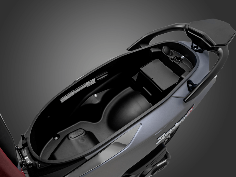 Type de moteur/cylindre Moteur 4 temps, - monocylindre - Déplacement 168,9 cm3 - Système d'alimentation en carburant EFI - Puissance maximale 9,0 kW / 7 500 tr/min - Couple max. 12,5 kW / 6 000 tr/min - Circuit de refroidissement AIR - Transmission à variation continue (CVT) - Longueur x Largeur x Hauteur (mm) 2 070 x 735 x 1 190 mm - Empattement (mm) 1 385 mm - Poids à vide 128 kg - Suspension avant Fourche télescopique - Suspension arrière Double choc - Matériau de la jante avant/arrière Aluminium/Aluminium - Dimensions du pneu avant 110 / 70-16 - Dimensions des pneus arrière 120 / 80-14 - Type/diamètre des freins avant Disque Ø 260mm + ABS - Type/diamètre des freins arrière Disque Ø 220mm + ABS - Capacité de carburant 7 L+ 100 dt frais carte grise