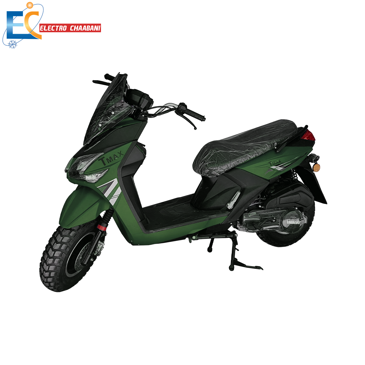 Scooteur UNISCOOT TMAX - Moteur: 125 cm³ 4 temps - Vitesse Maximale: 120 km/h - Frein: disque / tambour - Avec alarme - Dimensions: 2050 x 750 x 1250 mm - Couleur: Vert Militaire - Garantie: 2500 KM