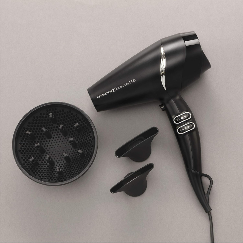 Sèche-cheveux Remington SUPERCARE PRO - Puissance 2200 W - Vitesse de l'air de 130 km/h - Poids léger et design compact : coiffage confortable - Moteur AC professionnel : longue durée et qualité salon - Grille ionique céramique : chaleur uniforme et antistatique - Technologie ionique supérieure - 2x plus d'ions - 3 réglages de température / 2 réglages de vitesse - Air froid pour fixer la coiffure - Concentrateur 11 mm spécial séchage - Concentrateur fin 7mm pour des styles lisses - Diffuseur : dessine les boucles et ajoute du volume à vos cheveux - Grille arrière amovible - Anneau de suspension - longueur Cordon 3 m - Garantie 1 an