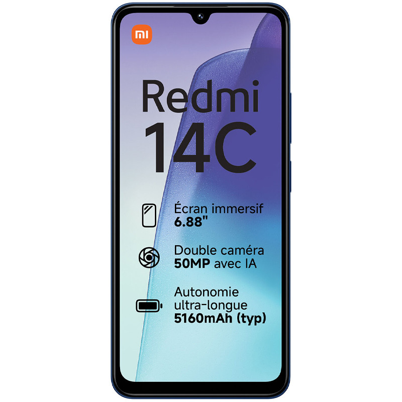 Esthétique arrondie Glamour à portée de mainSon design arrondi se démarque comme un phare dans la nuit, et dépasse du boîtier de l'appareil pour donner une impression d'harmonie visuelle et d'élégance.Boîtier ultra-finÉlégantÉcran cinéma de 6,88"Grand écran immersifProfitez du tout premier écran 6,88" de la série Redmi, qui vous permet d'apprécier un contenu encore plus immersif et cinématographique que jamais auparavant. Associé à un taux de rafraîchissement élevé, qui s'ajuste automatiquement, jusqu'à 120 Hz, le Redmi 14C vous offre une expérience visuelle d'une qualité exceptionnelle.Deux certifications TÜV RheinlandÉcran à faible lumière bleue de nouvelle générationGrâce à la gradation CC permanente, la faible lumière bleue, l'absence de scintillement visible et le mode sombre, le logiciel et le matériel protègent vos yeux à deux niveaux, réduisant efficacement la fatigue et les problèmes oculaires en cas d'utilisation prolongée.Images 50 MP ultra-nettesSystème puissant de double caméra IACapturez chaque image avec un niveau de détail exceptionnel grâce à une caméra principale ultra-haute résolution. Associé au puissant moteur Xiaomi Imaging Engine, il optimise la qualité et la vitesse de l'image à partir de la technologie sous-jacente pour donner vie à chaque instant.Effet argentique filmCameraPhotos et vidéos avec styleLes filtres ne sont pas uniquement destinés aux photos : le mode Vidéo propose désormais des filtres filmCamera et Pro LUT texturés et classiques, ce qui vous permet de renforcer vos récits à l'aide d'une variété d'options créatives.Batterie de 5 160 mAh (type)Charge rapide de 18 WUne combinaison parfaite de batterie puissante et de charge rapide. Le Redmi 14C est également doté d'un moteur de charge intelligent et d'une technologie de batterie sûre, garantissant une batterie durable et saine.Jusqu'à 16 Go de RAMExtension de mémoireGrâce à la technologie d'extension de mémoire, la RAM peut être étendue jusqu'à 16 Go*. Profitez de performances système plus fluides, d'un chargement rapide des applications et d'un basculement aisé entre les opérations.Helio G81-UltraPuissant processeur 8 cœursLe nouveau MediaTek Helio G81-Ultra offre une faible consommation d'énergie et des hautes performances. Grâce à ses capacités exceptionnelles, il garantit une autonomie de la batterie accrue, moins de ralentissement et une formidable expérience utilisateur.Une qualité extraordinairegrâce à des normes strictes210 000 tests des boutons d'alimentation / 300 tests de chutes / 5 000 tests de la prise casque / 10 000 tests du port de charge