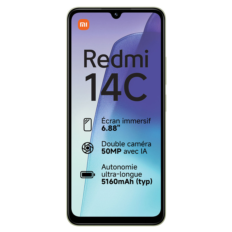 Écran 6,88" LCD IPS (1640×720 pixels ), 120Hz - Deux certifications TÜV Rheinland - Processeur: MediaTek Helio G81-Ultra Octa-core - Système d'exploitation: Android 14, HyperOS - Mémoire RAM: 6Go (extensible jusqu'à 14Go) - Stockage: 128Go - Appareil photo Arrière: Dual AI 50MP + 2MP - Appareil Frontale: 13MP - Wi-Fi, 4G et Bluetooth 5.4 - Batterie: 5160 mAh - Charge rapide 18W - Jusqu'à 22 heures de lecture vidéo - Empreintes digitales latérales, Déverrouillage du visage par l'IA - Couleur: Vert - Garantie: 1 an